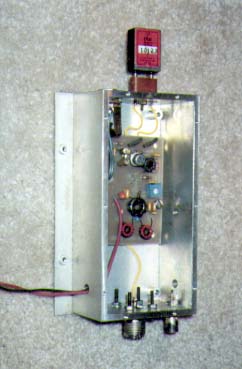 The transmitter is shown in an aluminum box with an FT-243 crystal socket and key jack on the front. There are 2 RF jacks on the back, an SO-239 type for the antenna, and a BNC for the antenna output to the RX via a PIN diode switch circuit that is not shown.