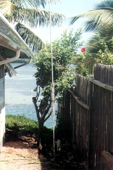 The antenna has been used at QRP and 300W levels on all bands with great results! It's proximity to Kaneohe Bay and sea level is a primary factor in it's performance. The ground system consists of an 8' pipe driven into the ground, with good mechanical and electrical bonding. The 3'mounting pipe fits down into this pipe. A ground point on this lower support section is electrically bonded with an 8" braid type lead. This allows the antenna to be released from it's radial system, removed and placed on the ground during extremely high winds or during hurricane warnings. The radial system has atleast 2 #14 insulated wires above ground for all bands from 7mhz and above. The 80 meter radials are on the ground and reach into the front yard, and 30' into and along Kaneohe Bay itself. I have installed the 160mtr loading kit and have a meandering 160 meter radial along the sea wall and the boat dock.(not easy to see in the photo)